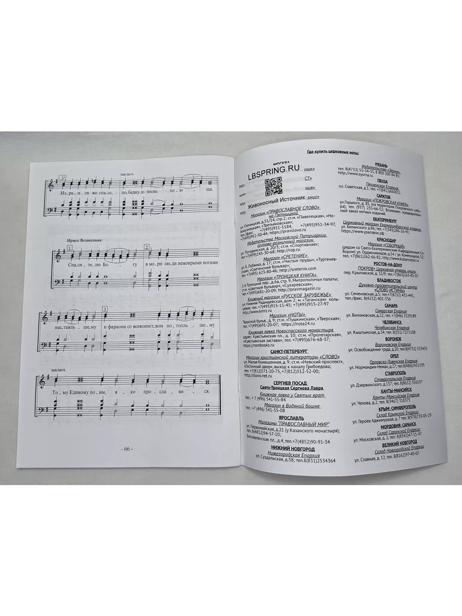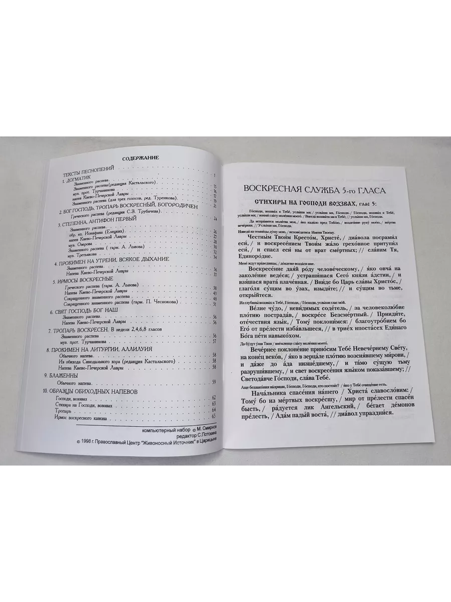 68 страниц, брошюра, 1998.Серия сборников Песнопения воскресной службы восьми гласов издается в восьми тетрадях (каждый глас и соответствующие песнопения Октоиха отдельным изданием). В данную серию вошли как известные, употребляемые в постоянной певческой практике, многими хорами песнопения, так и наиболее интересные на наш взгляд гармонизации различных напевов.Каждый сборник серии сопровождается текстовым разделом, песнопения которого для удобства исполнения разбиты на музыкальные фразы. Однако, данное деление можно считать условным, поскольку при исполнении на глас расстановка окончаний фраз оставляется на усмотрение регента. Тексты Октоиха дополняются Богородичными всех гласов, а также воскресными Евангельскими стихирами. Таким образом, регент хора, используя сборники данной серии, может выбрать песнопения различной сложности, начиная от пения по текстовому приложению, унисонных и более простых гармонизаций, до более сложных авторских произведений в зависимости от уровня и состава хорового коллектива.Приведенные в последнем разделе образцы обиходных гласовых напевов принадлежат к московской традиции, поэтому именно эти варианты напевов не являются обязательными при исполнении песнопений на глас, если в каком-либо храме существует другой вариант напева.Предназначен для хоровых коллективов, хормейстеров, регентов и всех интересующихся православной хоровой музыкой.ТЕКСТЫ ПЕСНОПЕНИЙДОГМАТИКЗнаменный распевЗнаменный распев, гарм. А. КастальскогоПрот. П. ТурчаниноваНапев Киево-Печерской ЛаврыЗнаменный распев, гарм. А. ТуренковаБОГ ГОСПОДЬ, ТРОПАРЬ ВОСКРЕСНЫЙ, БОГОРОДИЧЕНГреческий распев, гарм. о. Сергия (Трубачева)СТЕПЕННА, АНТИФОН ПЕРВЫЙЗнаменный распевЕп. Ионафан (Елецких)Напев Киево-Печерской ЛаврыН. ОзеровЗнаменный распев, гарм. А. ЛьвоваА. ТретьяковПРОКИМЕН НА УТРЕНЕ, ВСЯКОЕ ДЫХАНИЕЗнаменный распевНапев Киево-Печерской ЛаврыИРМОСЫ ВОСКРЕСНЫЕГреческий распев, гарм. А. ЛьвоваНапев Киево-Печерской ЛаврыСокращенный Знаменный распевСокращенный Знаменный распев, гарм. П. ЧесноковаСВЯТ ГОСПОДЬ БОГ НАШЗнаменный распевНапев Киево-Печерской ЛаврыТРОПАРЬ ВОСКРЕСЕН (в недели 1, 3, 5, 7 гласов)Знаменный распевПрот. П. ТурчаниноваПРОКИМЕН НА ЛИТУРГИИ, АЛЛИЛУИЯОбычный напевИз обихода Синодального хора, ред. А. КастальскогоНапев Киево-Печерской ЛаврыБЛАЖЕННЫОбиходный напевОБРАЗЦЫ ОБИХОДНЫХ НАПЕВОВ (5-й глас московского обихода)Господи, воззвахСтихира на Господи, воззвахТропарьИрмос воскресного канона