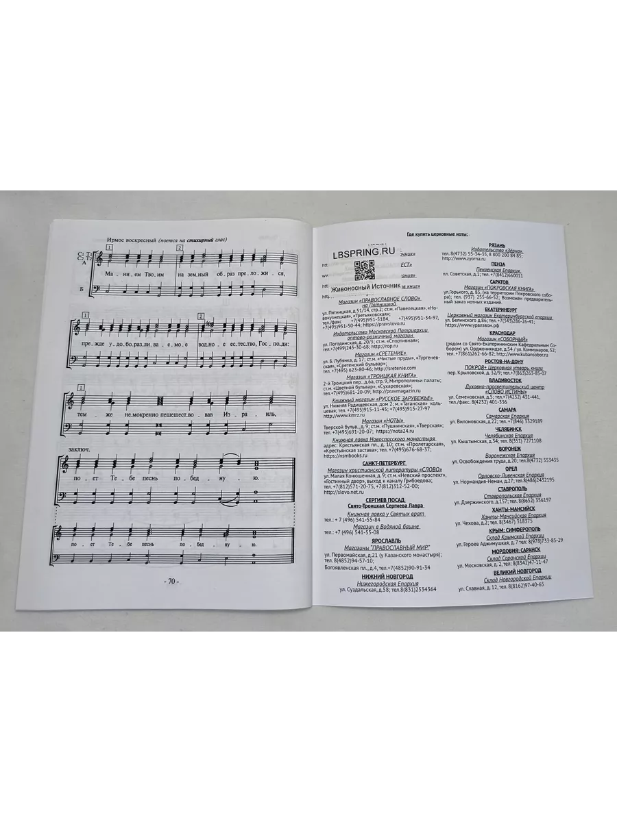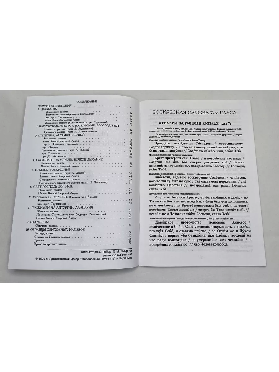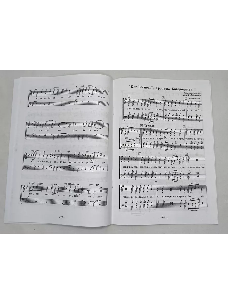 72 страницы, брошюра, 1998.Серия сборников Песнопения воскресной службы восьми гласов издается в восьми тетрадях (каждый глас и соответствующие песнопения Октоиха отдельным изданием). В данную серию вошли как известные, употребляемые в постоянной певческой практике, многими хорами песнопения, так и наиболее интересные на наш взгляд гармонизации различных напевов.Каждый сборник серии сопровождается текстовым разделом, песнопения которого для удобства исполнения разбиты на музыкальные фразы. Однако, данное деление можно считать условным, поскольку при исполнении на глас расстановка окончаний фраз оставляется на усмотрение регента. Тексты Октоиха дополняются Богородичными всех гласов, а также воскресными Евангельскими стихирами. Таким образом, регент хора, используя сборники данной серии, может выбрать песнопения различной сложности, начиная от пения по текстовому приложению, унисонных и более простых гармонизаций, до более сложных авторских произведений в зависимости от уровня и состава хорового коллектива.Приведенные в последнем разделе образцы обиходных гласовых напевов принадлежат к московской традиции, поэтому именно эти варианты напевов не являются обязательными при исполнении песнопений на глас, если в каком-либо храме существует другой вариант напева.Предназначен для хоровых коллективов, хормейстеров, регентов и всех интересующихся православной хоровой музыкой.ТЕКСТЫ ПЕСНОПЕНИЙДОГМАТИКЗнаменный распевЗнаменный распев, гарм. А.КастальскогоПрот. П. ТурчаниноваНапев Киево-Печерской ЛаврыЗнаменный распев, гарм. А. ТуренковаБОГ ГОСПОДЬ, ТРОПАРЬ ВОСКРЕСНЫЙ, БОГОРОДИЧЕНГреческий распев, гарм. Б. ЛедковскогоГреческий распев, гарм. А. АрхангельскийСТЕПЕННА, АНТИФОН ПЕРВЫЙЗнаменный распевНапев Киево-Печерской ЛаврыАрхиеп. Ионофан (Елецких)Н. ОзеровЗнаменный распев, гарм. А. ЛьвоваА. ТретьяковСвящ. Д. АллемановПРОКИМЕН НА УТРЕНЕ, ВСЯКОЕ ДЫХАНИЕЗнаменный распевНапев Киево-Печерской ЛаврыИРМОСЫ ВОСКРЕСНЫЕГреческий распев, гарм. А. ЛьвоваНапев Киево-Печерской ЛаврыСокращенный Знаменный распевСокращенный Знаменный распев, гарм. П. Чеснокова (Ор. 47)СВЯТ ГОСПОДЬ БОГ НАШЗнаменный распевНапев Киево-Печерской ЛаврыТРОПАРЬ ВОСКРЕСЕН (в недели 1, 3, 5, 7 гласов)Знаменный распевПрот. П. ТурчаниноваПРОКИМЕН НА ЛИТУРГИИ, АЛЛИЛУИЯОбиходный напевИз обихода Синодального хора, ред. А. КастальскогоНапев Киево-Печерской ЛаврыБЛАЖЕННЫОбиходный напевОБРАЗЦЫ ОБИХОДНЫХ НАПЕВОВ (3-й глас московского обихода)Господи, воззвахСтихира на Господи, воззвахТропарьИрмос воскресного канона