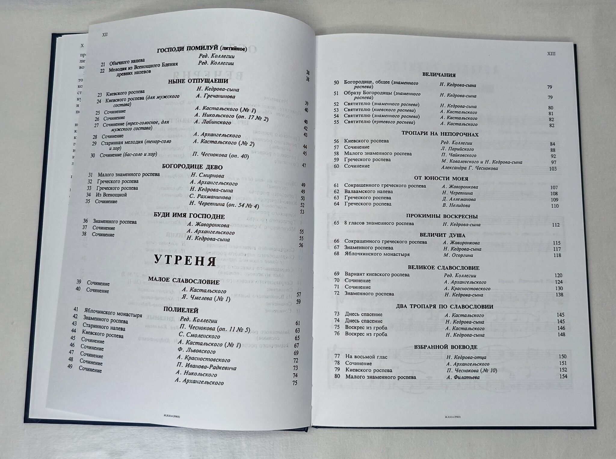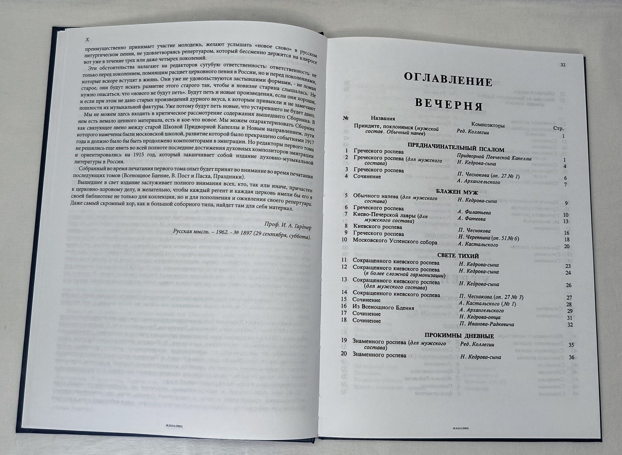 Сборник содержит изменяемые и неизменяемые песнопения Всенощного бдения. В сборнике преобладают сочинения композиторов Нового направления: А. Кастальского, П. Чеснокова, А. Никольского и др., а также композиторов «Русского рассеяния» первой половины XX века: Н. Кедровых (отца и сына), А. Красностовского, М. Ковалевского, Н. Черепнина, А. Жаворонкова, А. Филатьева и др. Большинство песнопений рассчитаны на исполнение как небольшим, так и большим смешанным хором. Также включены песнопения для однородного мужского хора.
